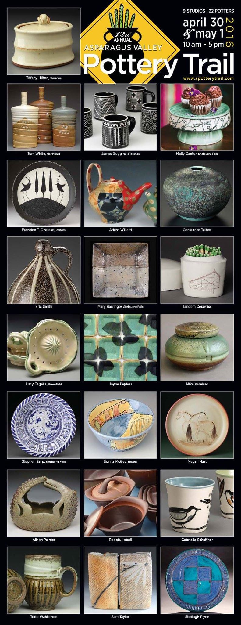 The Asparagus Valley Pottery Trail is a self-guided driving tour of 9 clay studios in the Connecticut River Valley in Western Massachusetts. We will have 12 guests in 2015, for a total of 21 potters.