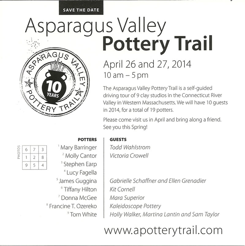 The Asparagus Valley Pottery Trail is a self-guided driving tour of 9 clay studios in the Connecticut River Valley in Western Massachusetts. We will have 10 guests in 2014, for a total of 19 potters.