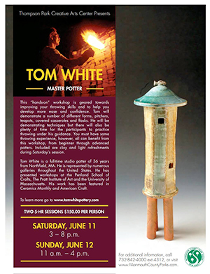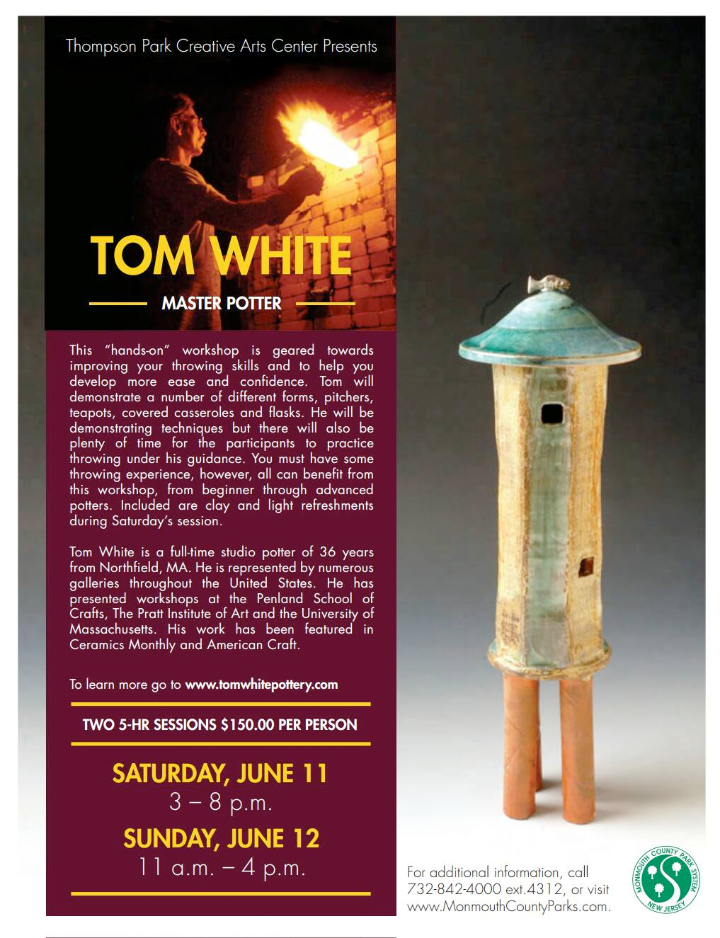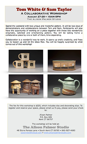 This will be a wonderful 1 day workshop. Tom will demonstrate how he throws and alters his pots including covered ovals, flasks, pour bottles, mugs and his T-pots. You will be to see the entire process of throwing, altering, assembling, lid and spout making, and more. There will be time for questions and answers. Come, be inspired, make new friends, take notes, and enjoy a day spent watching a master at work - $50